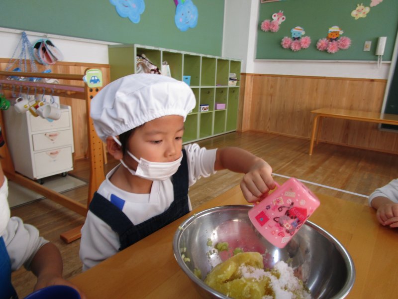 すみれ組では先日、園の畑で掘ったさつまいもで茶巾絞りを作りました!