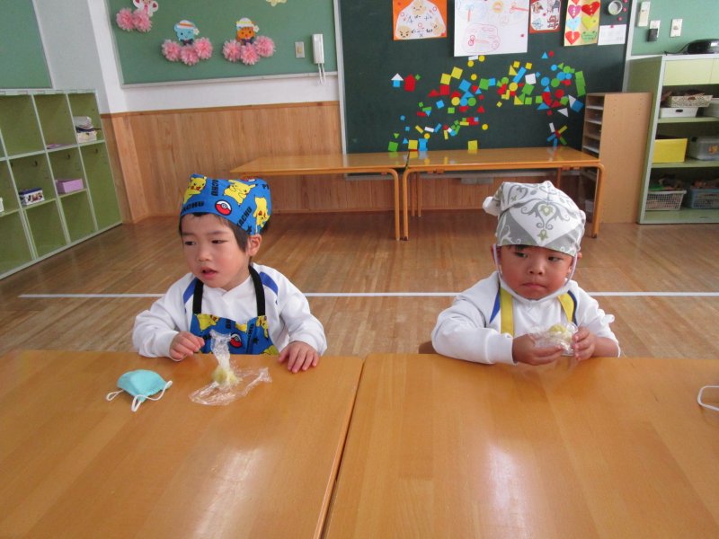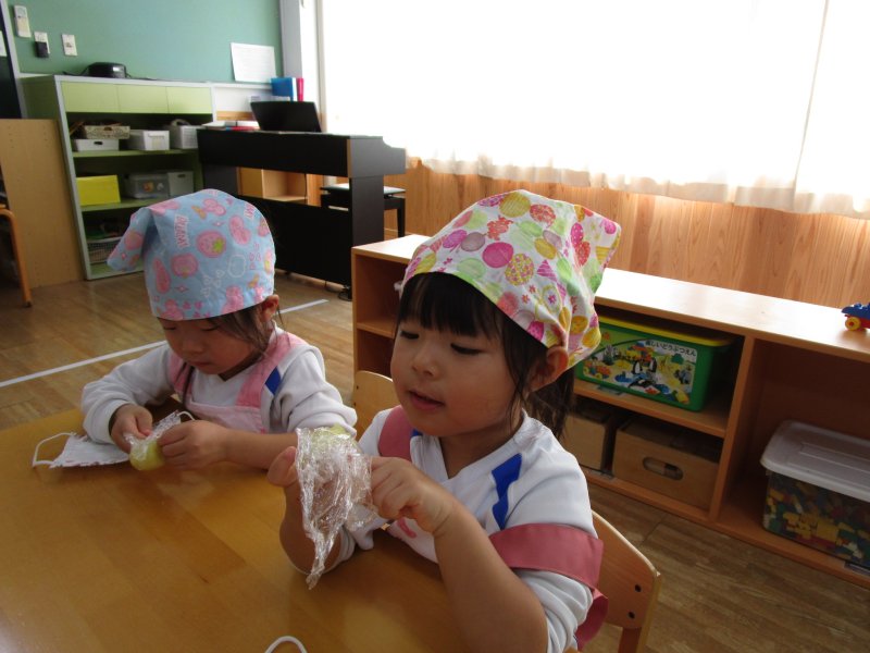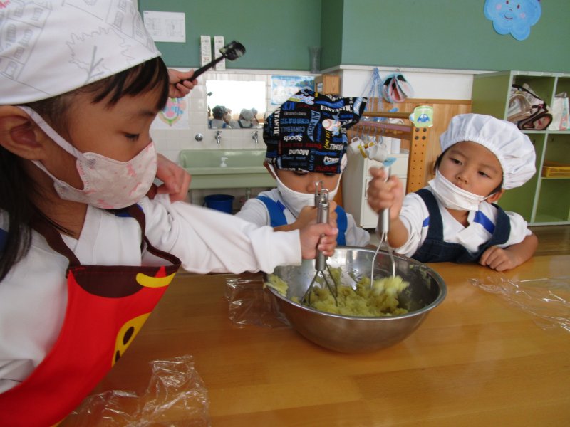 みんなで砂糖を入れてマッシャーで芋を潰しました!前回のじゃがいもの時よりも力強く潰すことができていましたよ!ラップで包むときは握るとはみ出たり、絞る所で少し難しそうにする姿がありましたが、一生懸命作っていました!