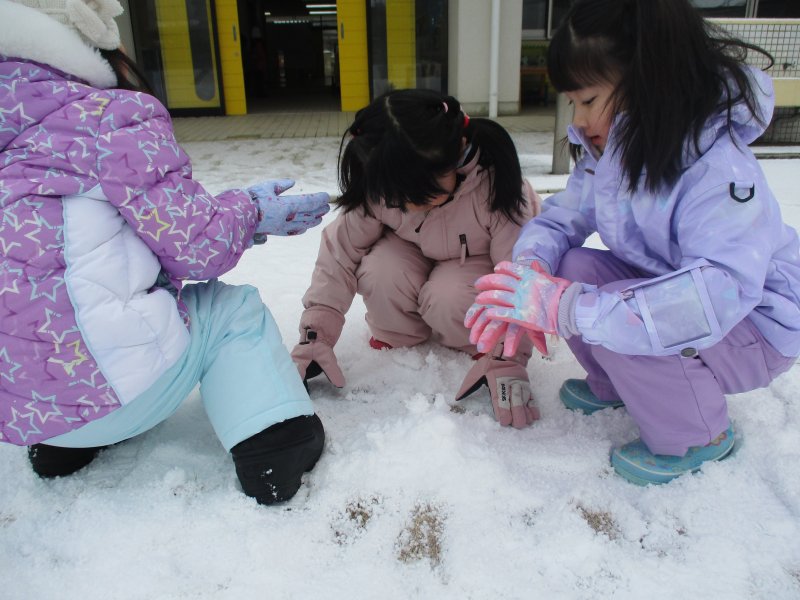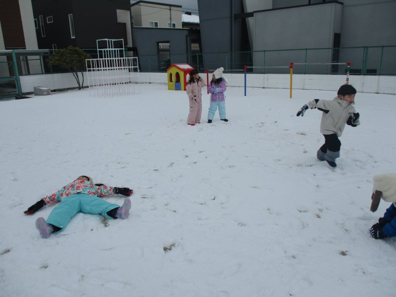 「ふかふかだ~‼」と寝転んだり、「なんか音がするよ‼」と雪を踏む感触を楽しんでいる子もいました。