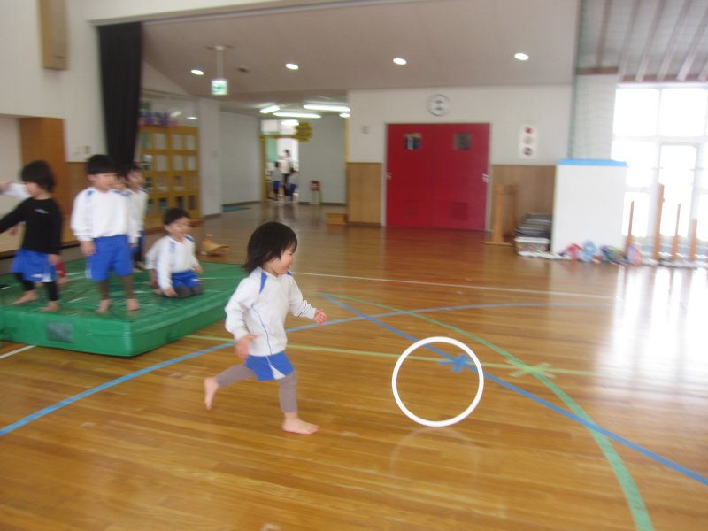 フープでは先生が転がしたものを追いかけて、同じ色が描いてあるコーンに入れました。